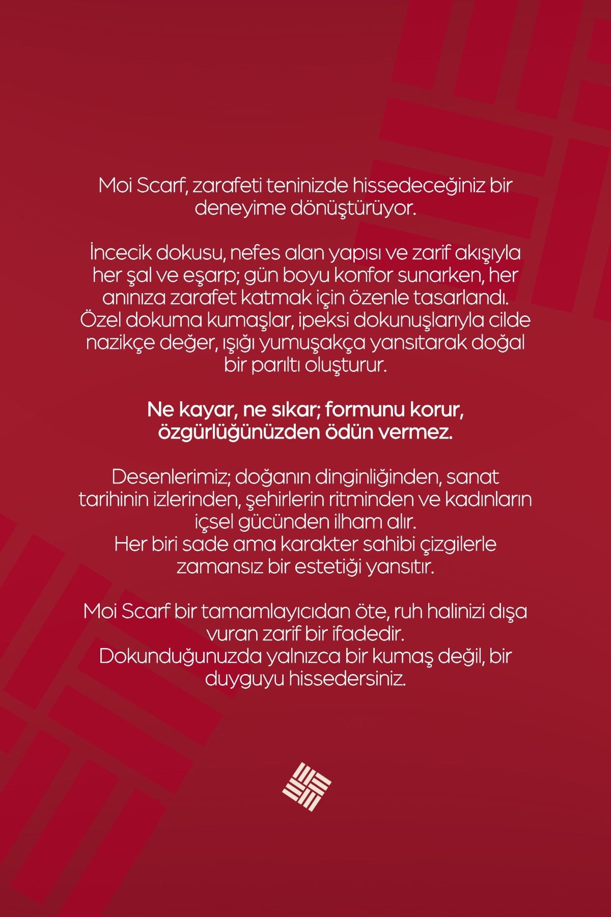 Her detayı özenle işlenen bu eşarp, minimalizmin zarafetini MOI SCARF’ın kültürüyle harmanlar. “Voile de Lin”, giyenin ruhuna dinginlik katar; hem gündüzün aydınlığında hem de akşamın huzurunda zarif bir eşlikçi olur.