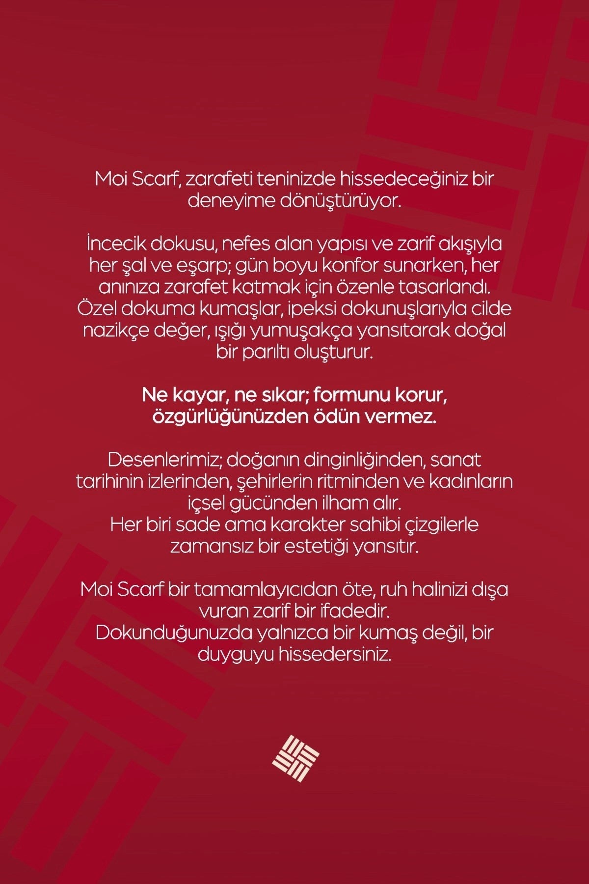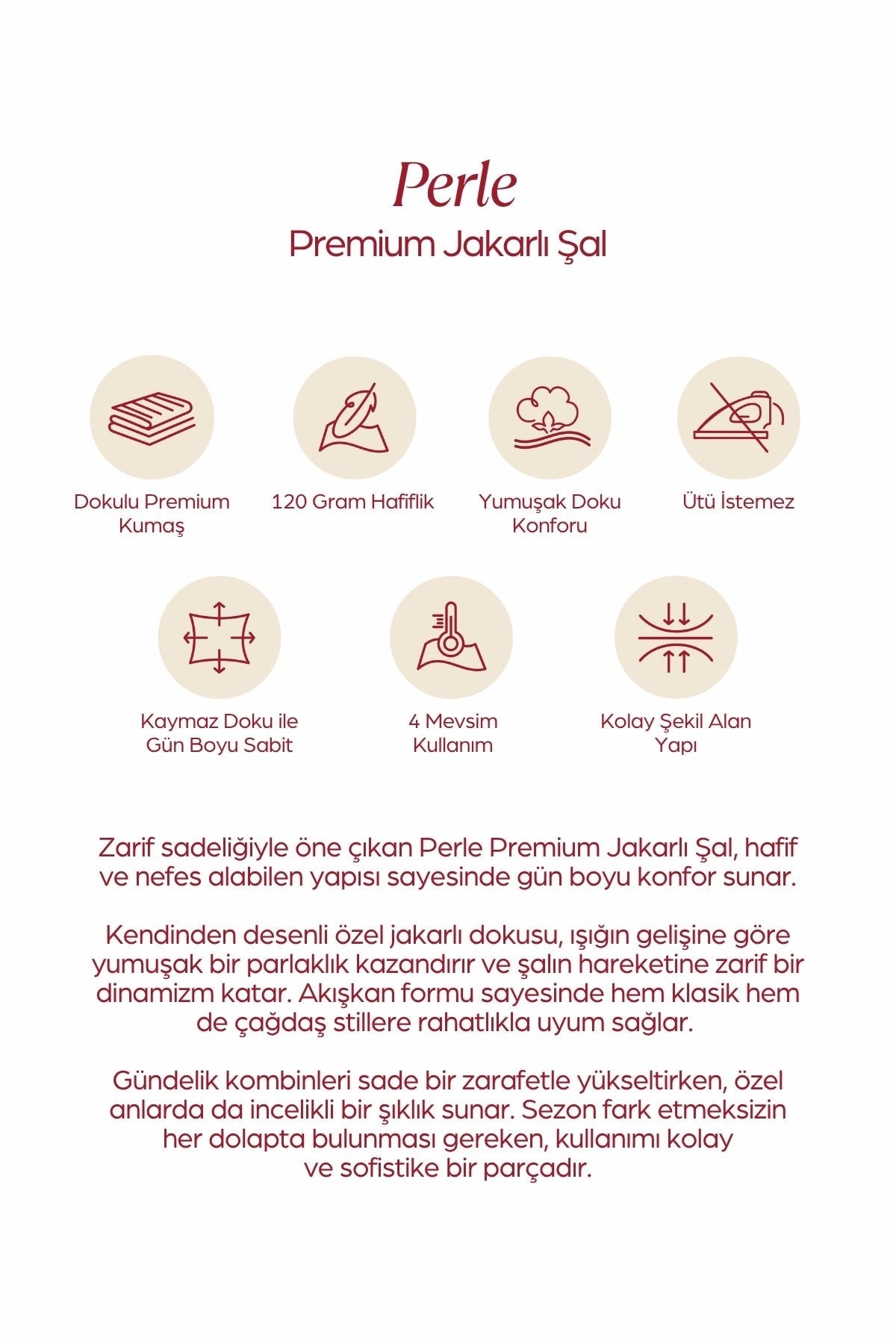Zarif sadeliğiyle öne çıkan Perle Premium Jakarlı Şal, hafif ve nefes alabilen yapısı sayesinde gün boyu konfor sunar. Kendinden desenli özel jakarlı dokusu, ışığın gelişine göre yumuşak bir parlaklık kazandırır ve şalın hareketine zarif bir dinamizm katar. Akışkan formu sayesinde hem klasik hem de çağdaş stillere rahatlıkla uyum sağlar. Gündelik kombinleri sade bir zarafetle yükseltirken, özel anlarda da incelikli bir şıklık sunar. Sezon fark etmeksizin her dolapta bulunması gereken, kullanımı kolay ve sofistike bir parçadır.